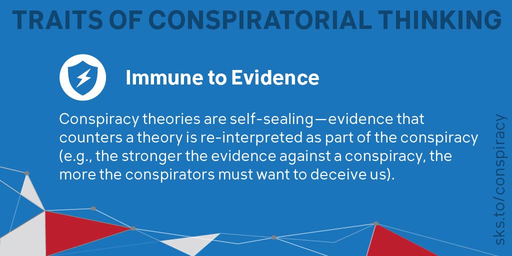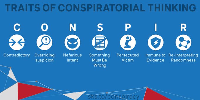 Here are the 7 tell-tale traits of conspiratorial thinking, summarized (& more easily remembered) with the acronym CONSPIR. More details in The Conspiracy Theory Handbook