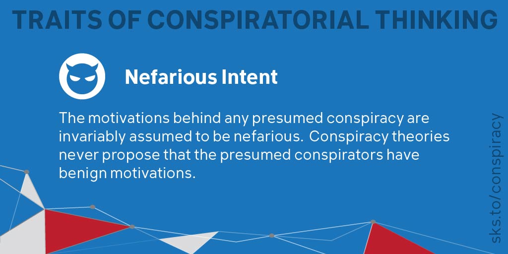 4/9 NEFARIOUS INTENT: The motivations behind any presumed conspiracy are invariably assumed to be nefarious. Conspiracy theories never propose that the presumed conspirators have benign motivations.