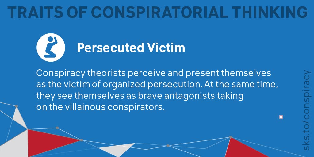 6/9 PERSECUTED VICTIM: Conspiracy theorists present themselves as victims of organized persecution. At the same time, they see themselves as brave antagonists taking on conspirators. Conspiratorial thinking involves a self-perception of simultaneously being a victim and a hero.