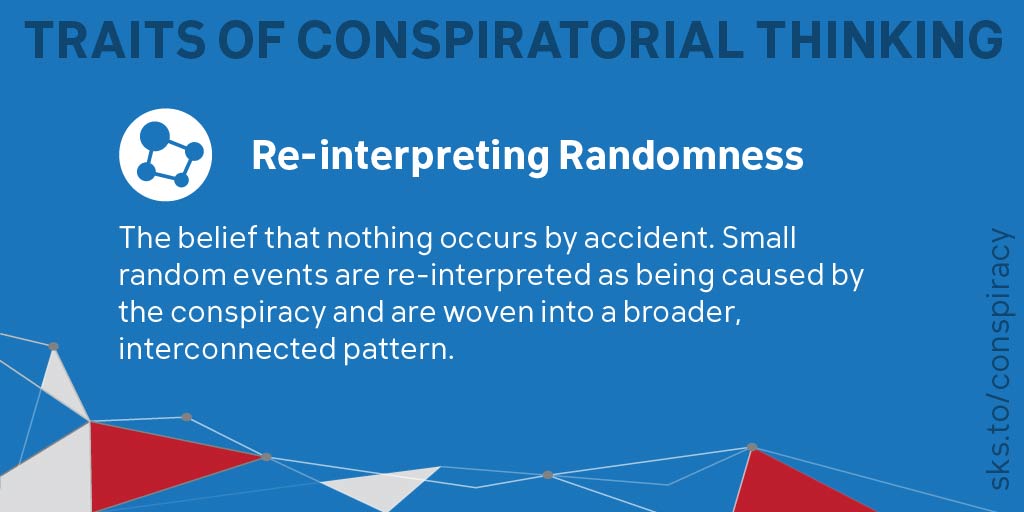 9/9 RE-INTERPRETING RANDOMNESS: The overriding suspicion found in conspiratorial thinking results in the belief that nothing occurs by accident. Small random events are re-interpreted as being caused by the conspiracy. More details at